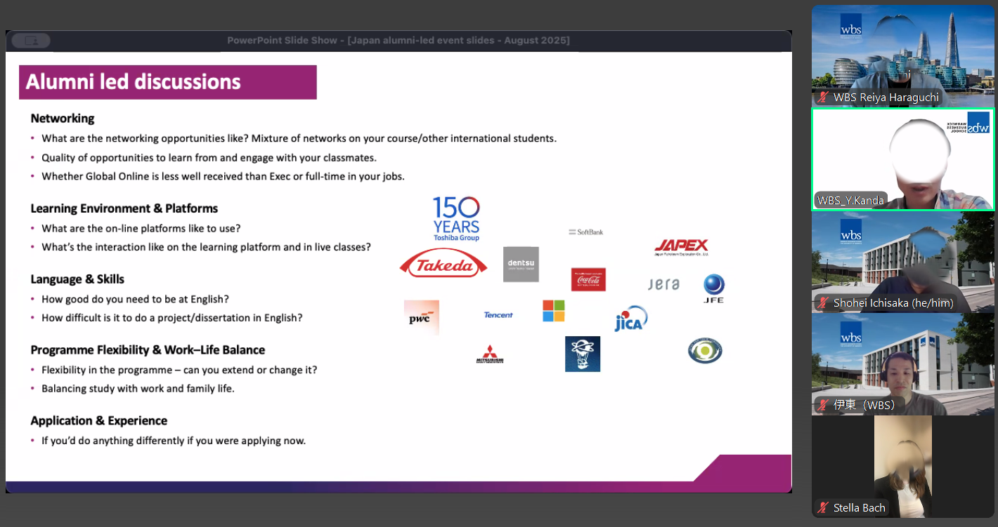 内容は①15分ほど学校紹介、②わたしも含めた5名が自己紹介、③質疑という形で進めました。在校生はわたしとStellaさんだけでして、幸いにも1か月前にM&A講義でフルタイムMBA学生と交流していたので、フルタイムに関連する質問も回答できました。英国のビザが昨年より改悪され、学士や修士学生は家族帯同のビザが発給されず、社費留学生からの英国人気が低下しているポイントも説明しました。