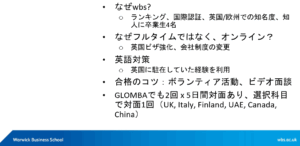 わたしからのメッセージとして、フルタイムMBAこそ自己投資の賜物(私費なら)であるが、就職できないと投資回収できなくなるリスクを説明し、オンラインMBAという選択肢もあり得るということを伝えました。