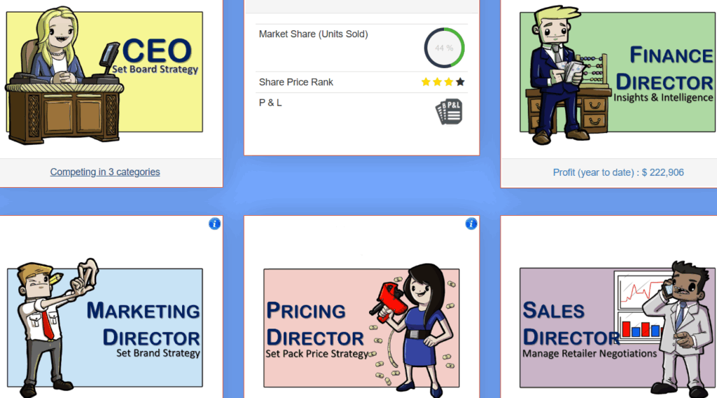- CEO: 会社がどのカテゴリーに進出するかしないか決定できます。 CEOが設定していないカテゴリーにはマーケティングディレクターがブランドを投入できません。 残る4人の中で能力が追い付いていない人が少なからずいるので、その人をフォローします。