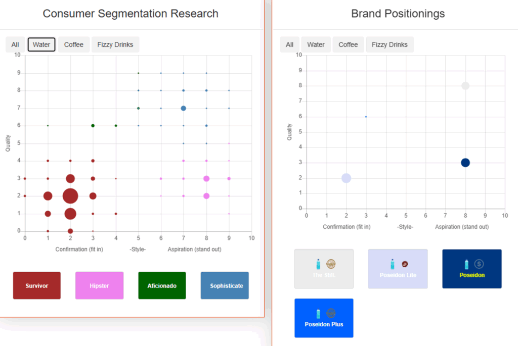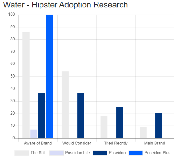 - 下図は Purchase funnel (水を購入するhipster)の例です。Poseidon という商品はawareness は38%程度にも関わらず、 main brandまで維持できています。一方、The Still はawareness 86%からwould consider で52%に落ち込んでいます。