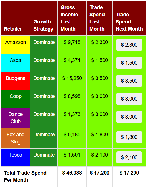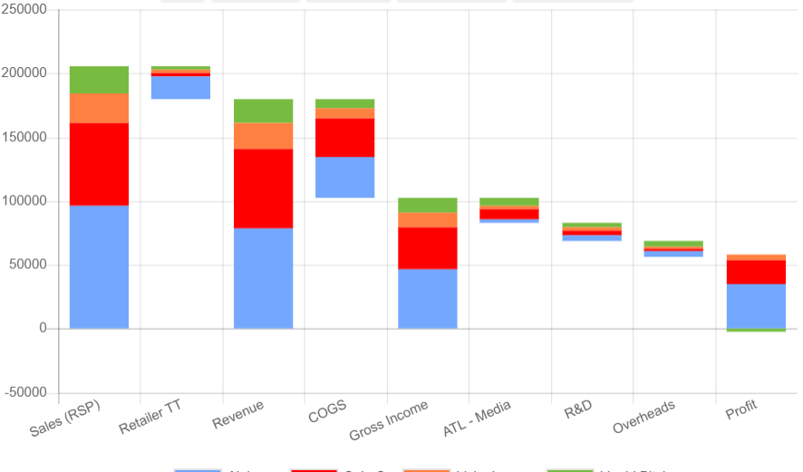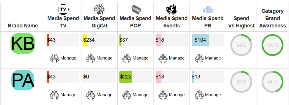 - 財務をチェックします。水色の自社は王者として、棚を占有する戦略を取っていたので、Retailer Total Trade が他社より多いです。一方で、メディアはターゲット層に集中していたので少ないです。