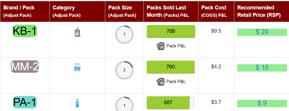 - 数週間程度でブランドが完成したら、プライシングディレクターがパックを設定します。売り値はいつでも無償で変更できるが、パック数は変更の旅に時間とR&Dコストがかかるので慎重に設定します。