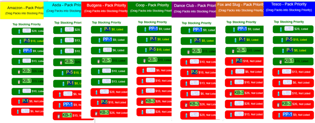 - 割り当てられた棚にどの商品を置くか決めます。Amazzonは全体の棚数が多いのですが、Dance clubはそもそも棚数が少ないです。 そして、Asdaはまとめ買いが中心なので1個入りの商品を置いても買ってくれません。一方でDance clubに8個入りの商品を置くことも然りです。