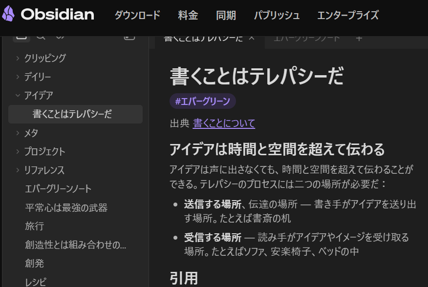 マークダウンはテキストベースですが、 # 見出し [] リンク などの簡単な記号を使うことで、フォントサイズや構造が変わり、とても読みやすくなります。そして最大のメリットは、ファイルサイズが非常に小さいこと。ノート1つにつきファイルは1つですが、テキストなので容量はほとんど増えません。さらに面白いことに、ChatGPTなどのAIの出力も基本的にマークダウン形式です。