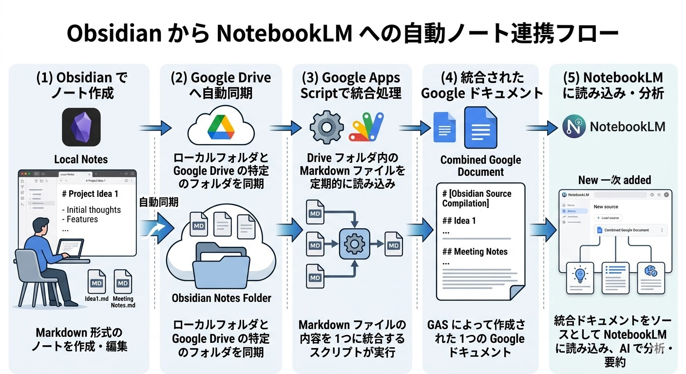 この方法を使うと、Obsidianで書いた知識が自動的にNotebookLMの知識ベースに集約されるようになります。 つまり、NotebookLMが自分の第二の記憶装置として機能するわけです。 実際に動いたときは、感動しました。