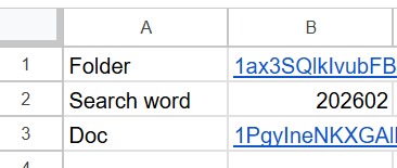 Google spreadsheet を好きなフォルダに作成します。 B1セルにObsidian のノートが保存されているフォルダの固有IDを指定、B2セルに 読み込みたいファイルの件名に含まれる単語を入力、B3セルに張り付けるGoogle documentの固有IDを手動で指定
